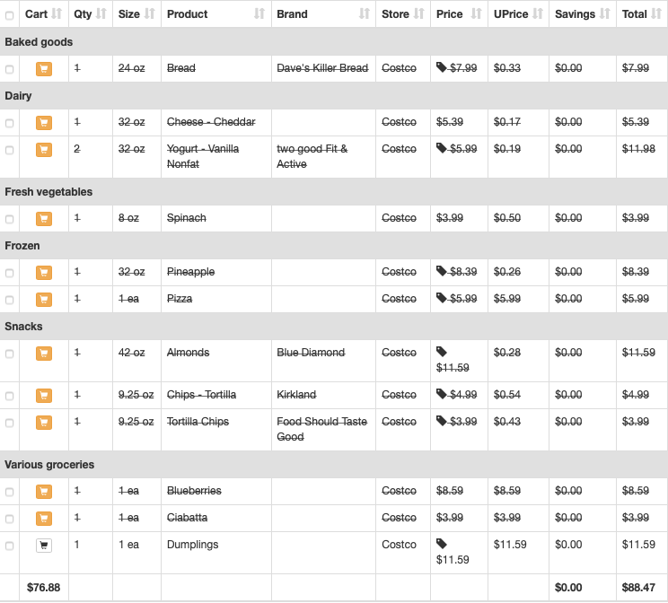 | Greek Yogurt | 2 | $5.99 | Aldi | $13.96 | $1.98 |