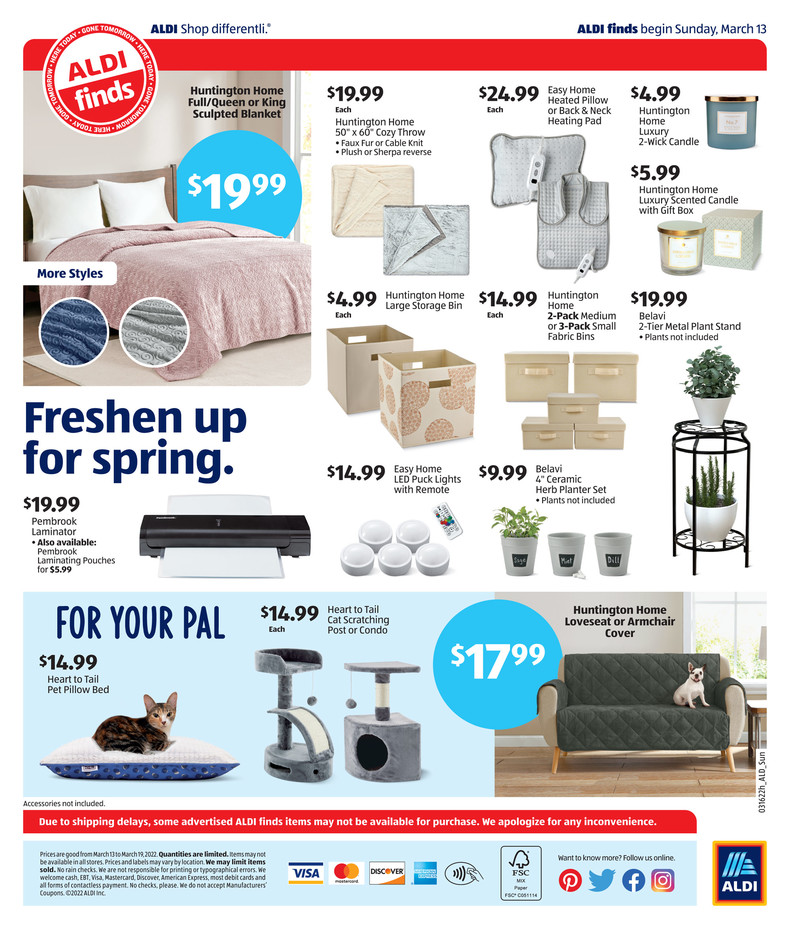 Aldi also notes the items where prices vary per store. Usually, a handful of products fall into this category weekly. Hopefully, your store is fully stocked with the Aldi Finds you are looking for. Below are those items that are listed as "not available in all stores" and/or "see price in store" for the week of March 13: