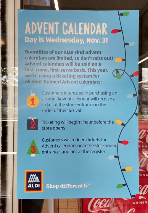 UPDATE: Here is a sign that is posted on the door to our local Aldi to help you prepare for Wednesday. I hope you get the Advent Calendar that you want this year!