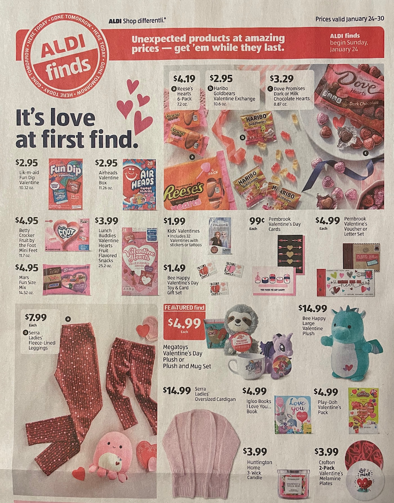 Check out the latest sales flyer for Aldi starting the week of January 24! The flyer is filled with more Valentine's Day goodies from stuffed toys to chocolate!