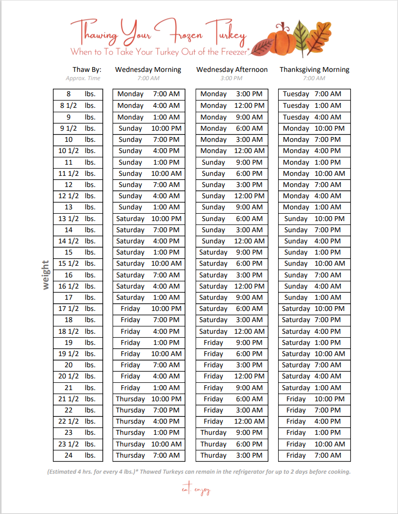 Most Thanksgiving dinners are not complete without the turkey as the centerpiece of the meal. Cooking the proper turkey could start days before Thursday morning if you purchased a frozen bird. A completely thawed turkey assures the best chances of a fully cooked meal. It also saves you from the added frustration of trying to defrost it when you probably have a list of 10 different things to do. So how do you know when to take the turkey out of the freezer or buy it at the supermarket on the day you want to start unthawing it? The chart below shows the time you need to put the turkey in the refrigerator if you want it defrosted by Wednesday, November 23 in the morning, afternoon, or Thanksgiving morning.