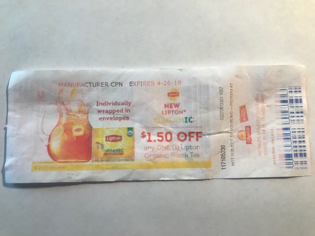 I didn't know that Lipton makes organic black tea!! Since I am set in my ways, and prices, with what brands of tea I drink, I only noticed the following coupon when I cleaned out my bag. The coupon printed like that, so do you think I'll have issues with redeeming it?