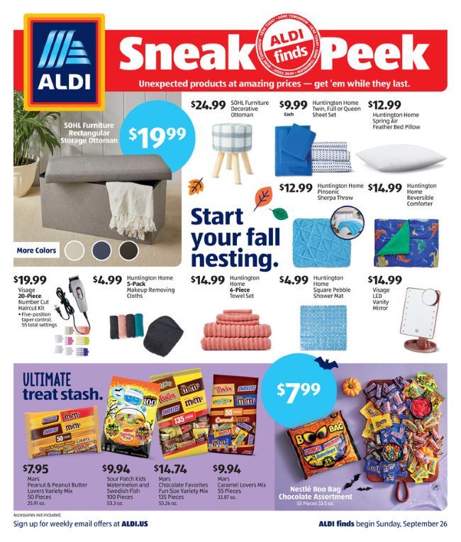 Although in some places, the weather feels more like July, it's officially fall! Check out the latest Aldi Finds Sneak Peek for the week of September 26. Be sure to search the list below for more items not shown in the flyer. Search over 90 items this week, including Halloween candy, fall-themed snacks, and more.