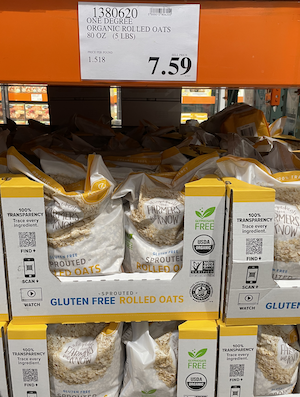 The One Degree Organic Rolled Oats are finally back at Costco. At $7.59 for 80 oz., it is the best price for organic oats. If I didn't have a Costco membership, the best price for organic oats is at our local ShopRite. Take a look at the price for organic oatmeal at other stores.