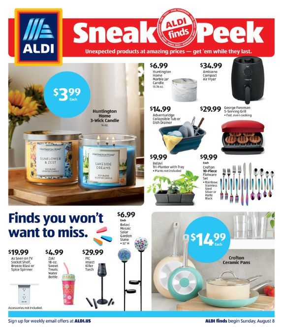 Start planning your weekly Aldi grocery list now with the latest Aldi Finds Sneak Peek. Sales begin, in some regions, on Sunday, August 8. Check out the complete list of other items not featured in this week's flyer.